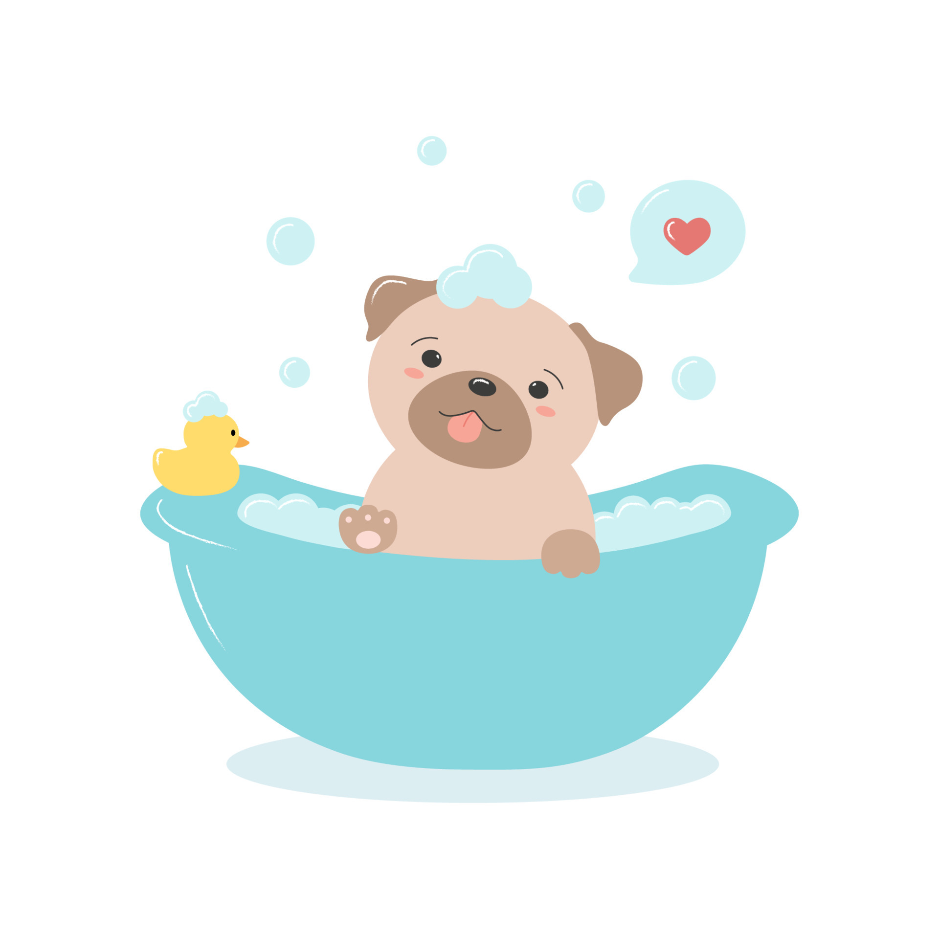 Kawaii Pug In A Bath With Bubbles And Rubber Duck Toy Cartoon Cute Dog For Pet Grooming Salon Vector Illustration Isolated On White Background 6439831 Vector Art At Vecteezy